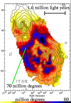 영국 천문학자들이 은하군 사이에서 천지를 뒤흔드는 충돌과 재조합을 관측했다. 충돌 속도는 초당 수천 킬로미터에 달하며, 발생한 충격파로 인해 은하군 사이의 기체 온도가 섭씨 1천만에서 1억 도에 이르렀다.